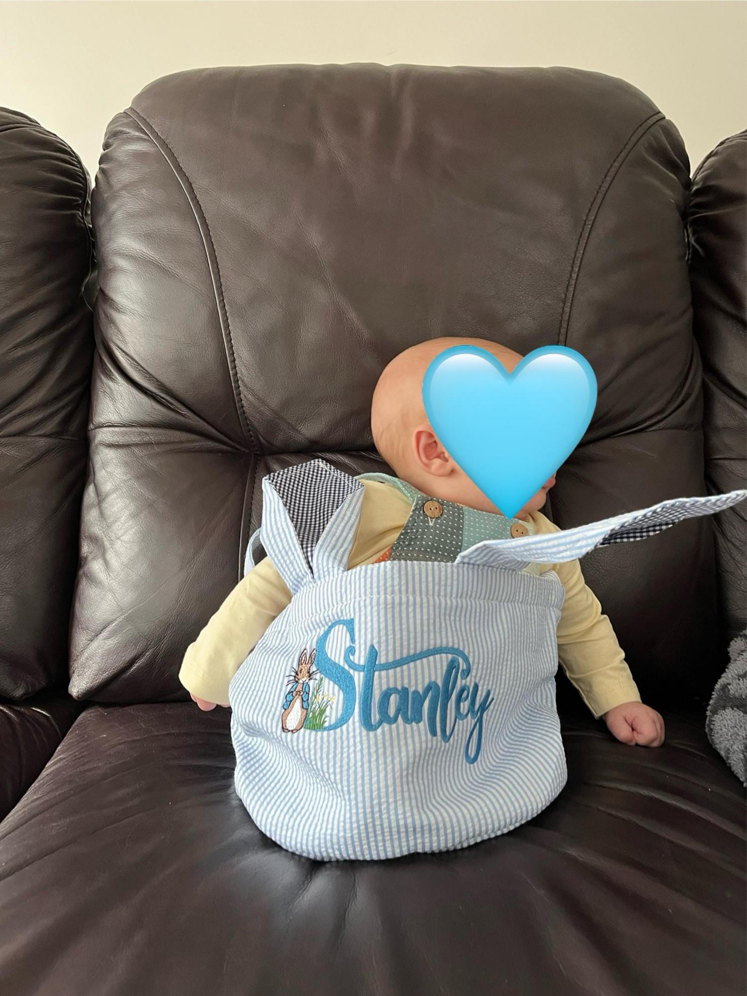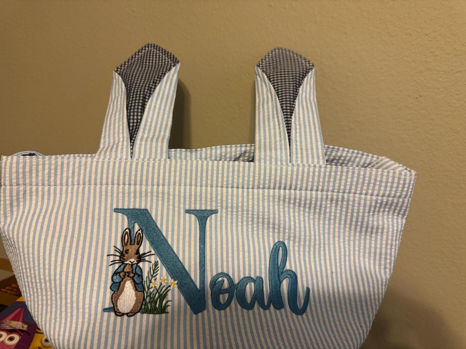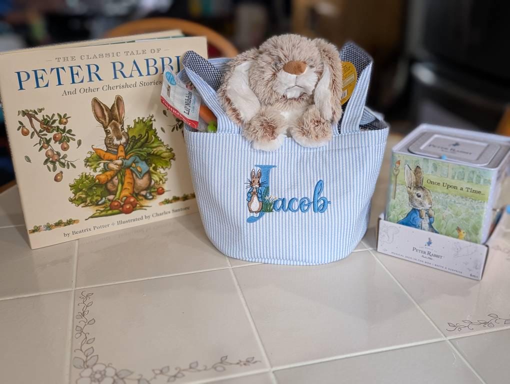Boys' Easter Basket, Embroidered Bunny Basket, Seersucker Easter Basket, Blue Easter Basket, Embroidered Bunny Pattern Basket
