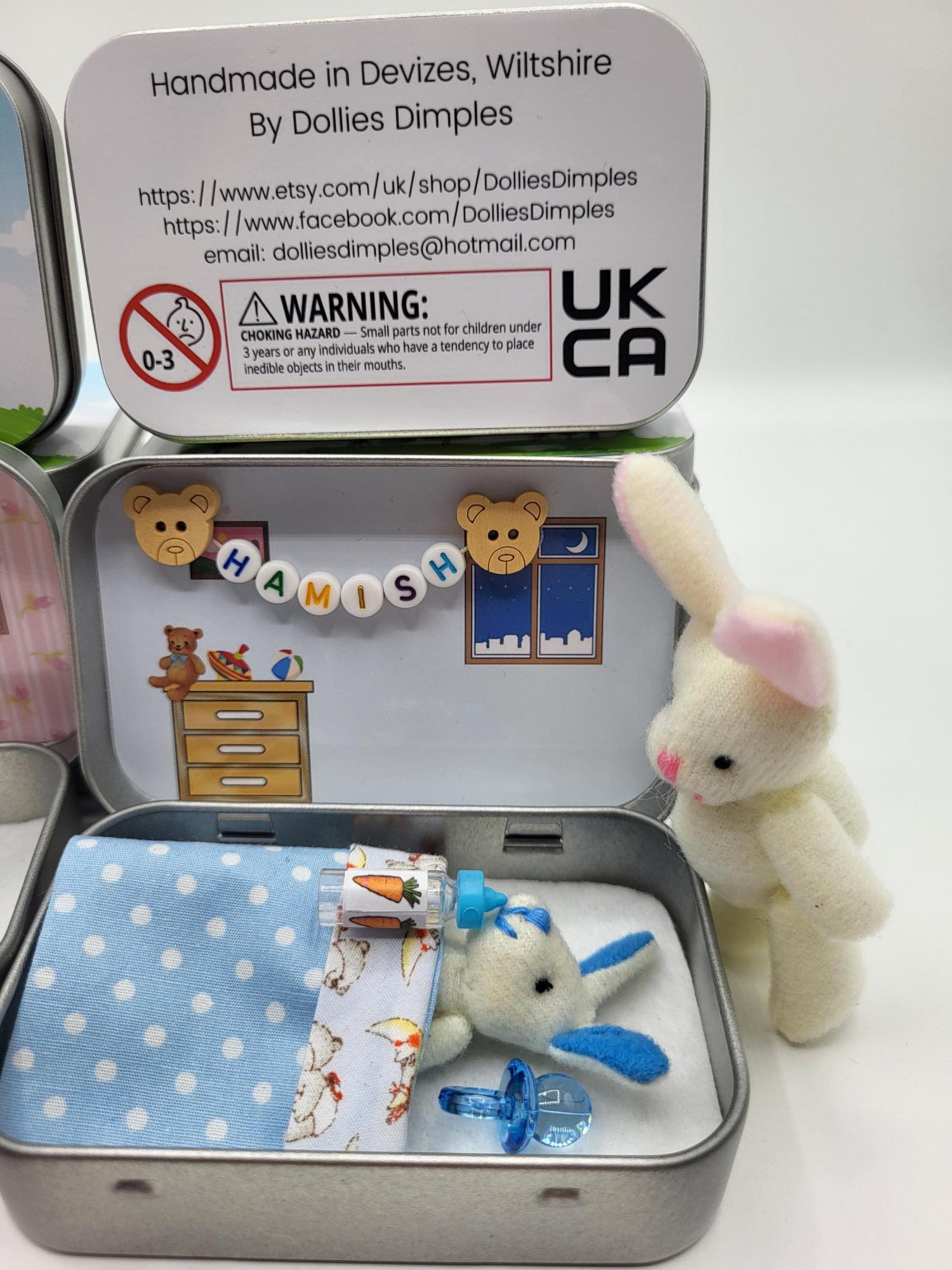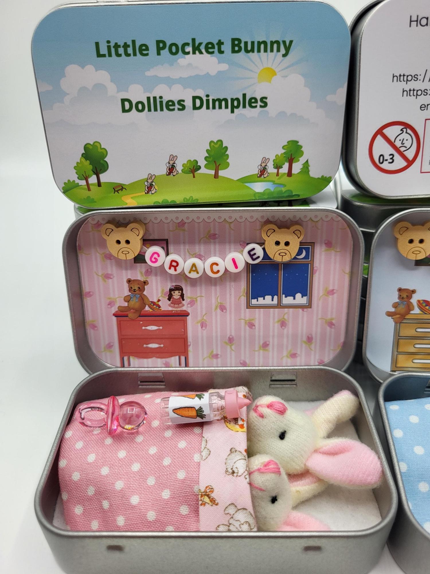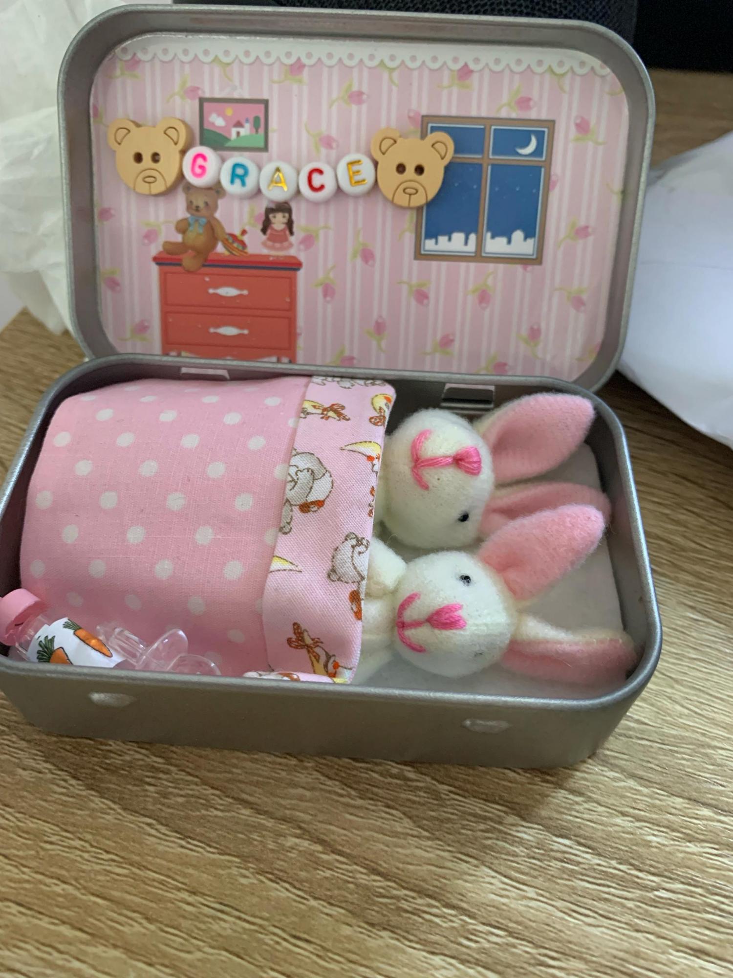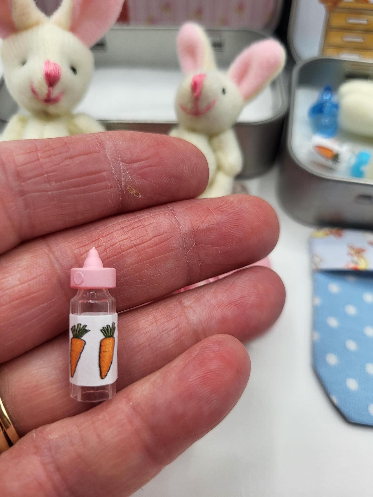 This mini tin box also includes a cute baby rabbit bottle (filled with carrot juice) and a small pacifier as accessories.