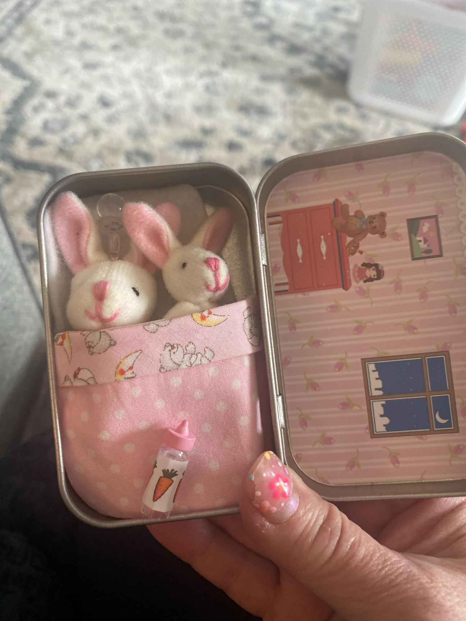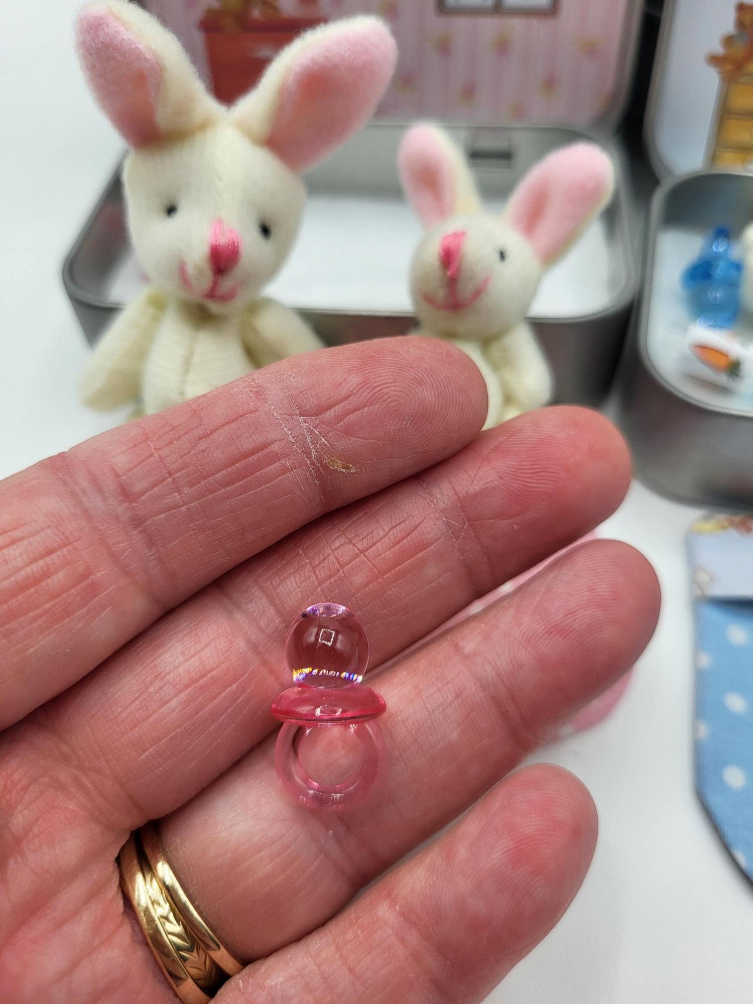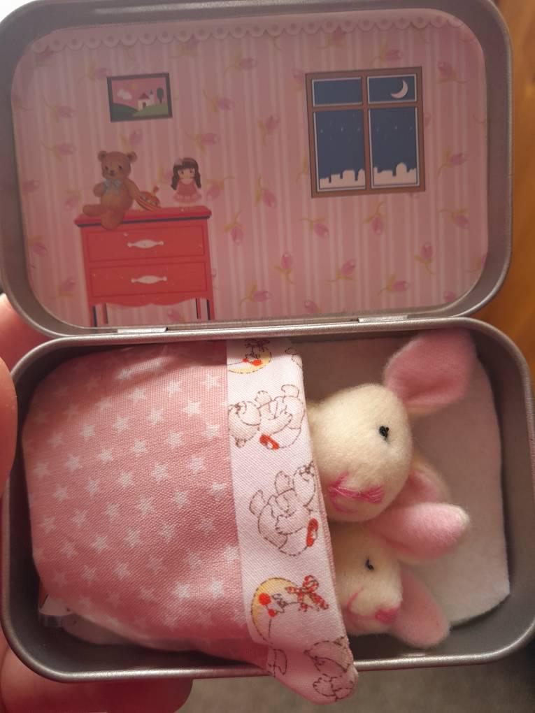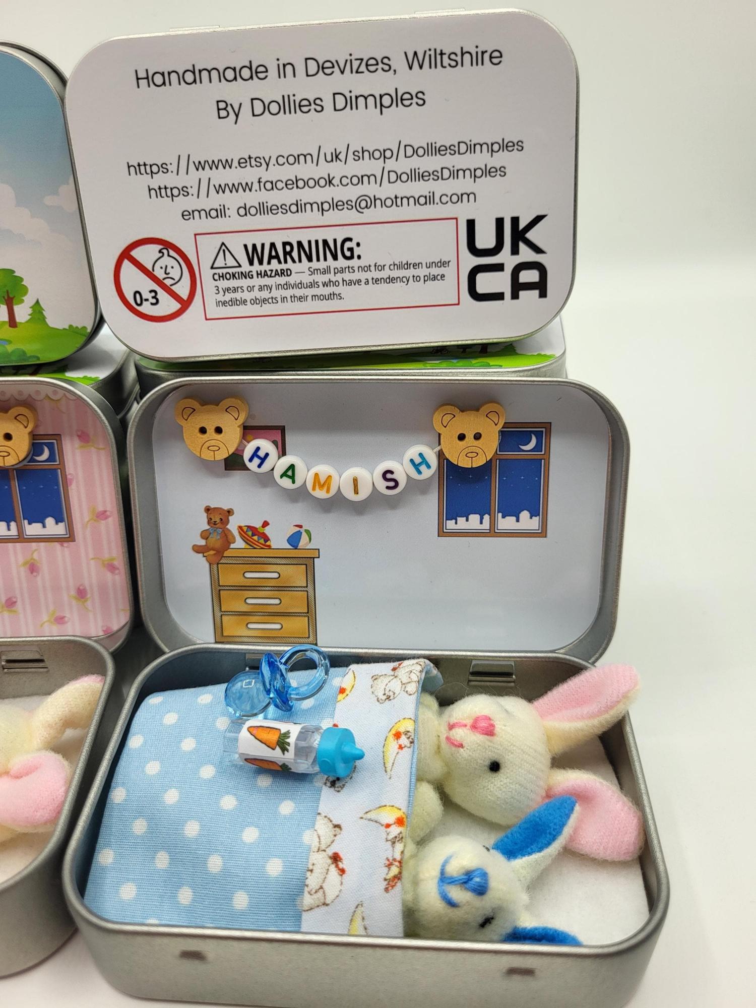 This mini tin box also includes a cute baby rabbit bottle (filled with carrot juice) and a small pacifier as accessories.