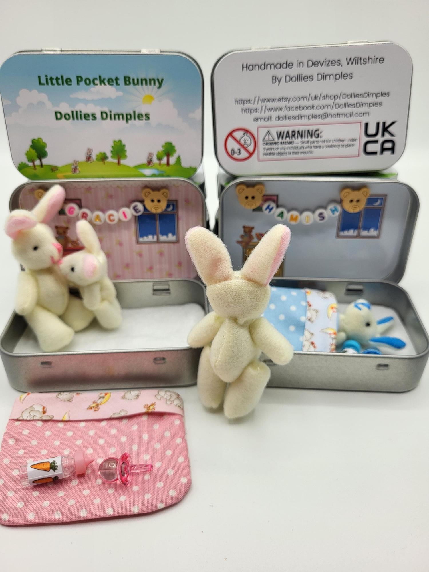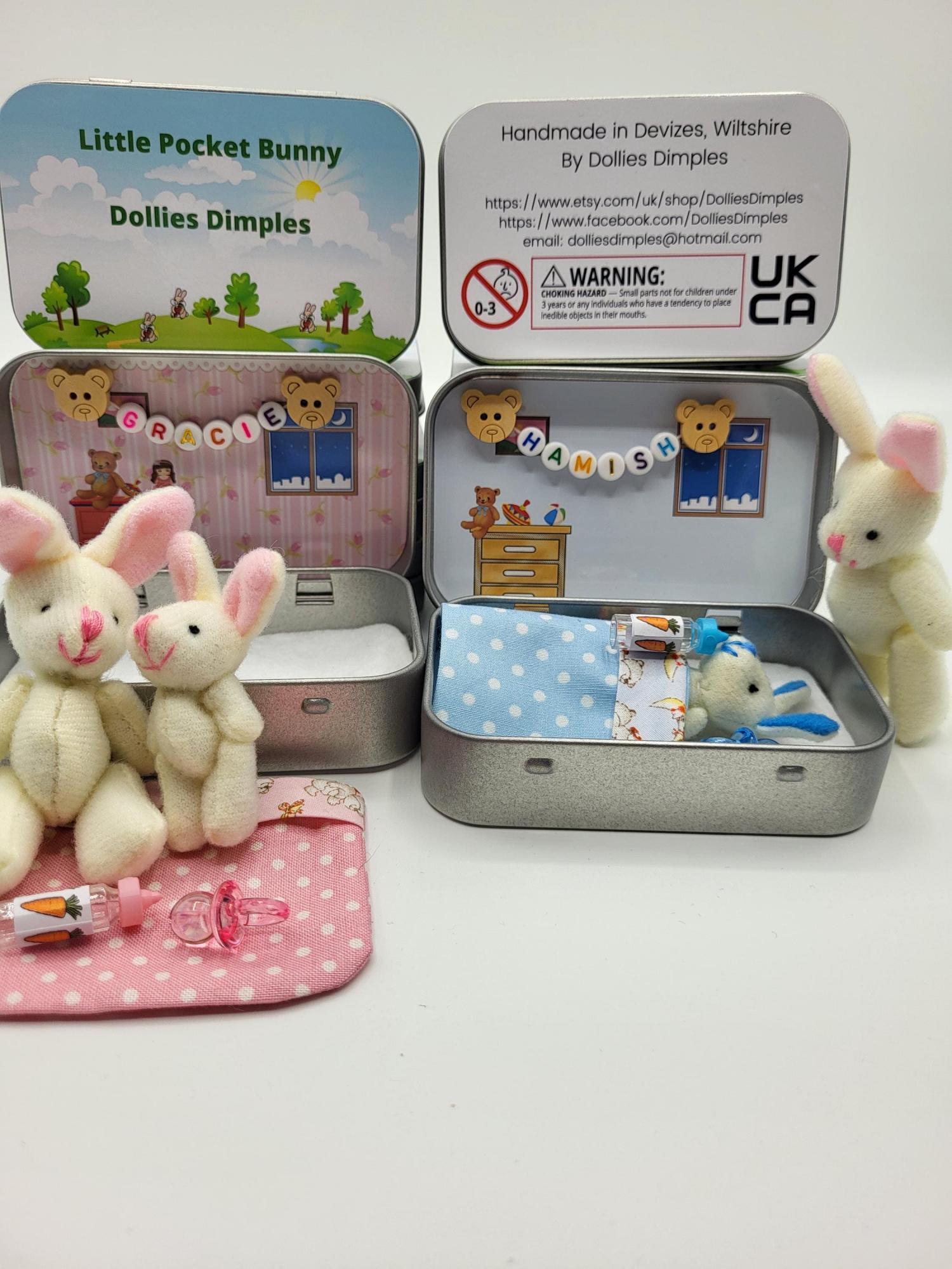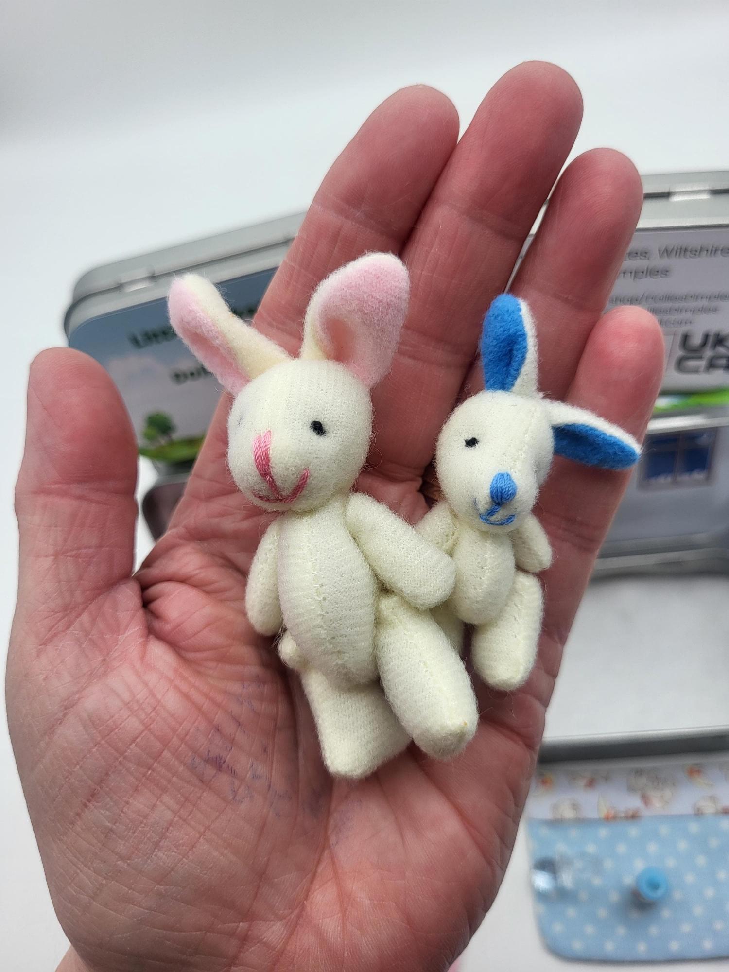 The baby rabbit with blue ears comes in a tin box with a blue vinyl sticker, and the baby rabbit with pink ears comes in a tin box with a pink vinyl sticker. The tin box measures approximately 9 cm.
