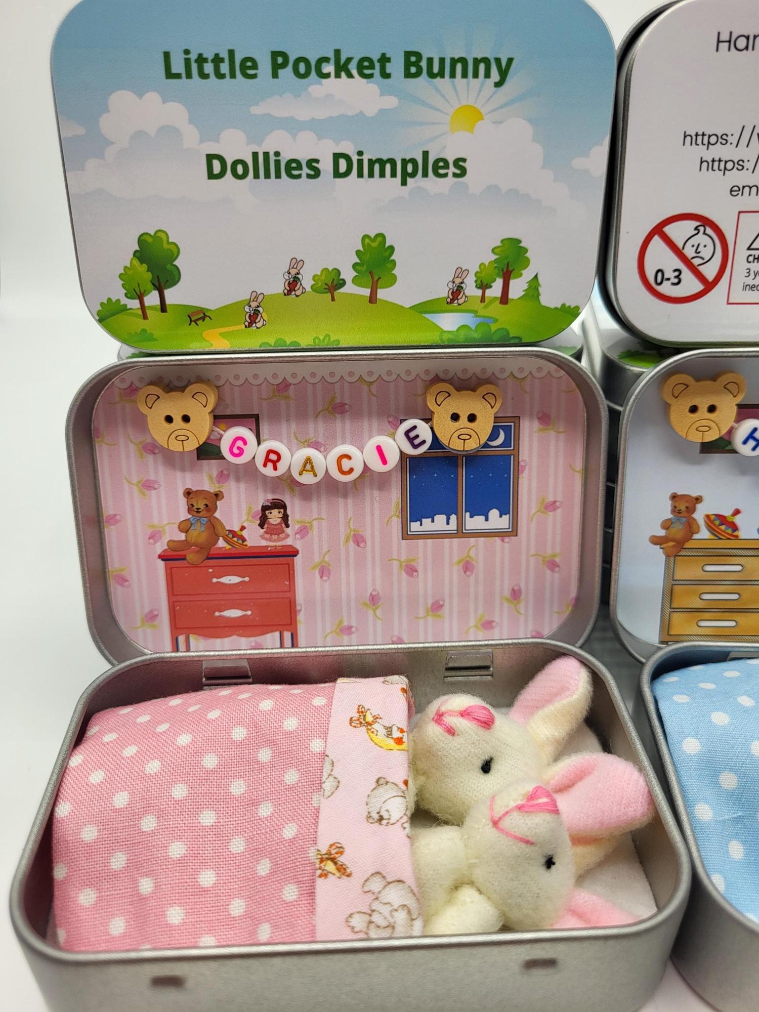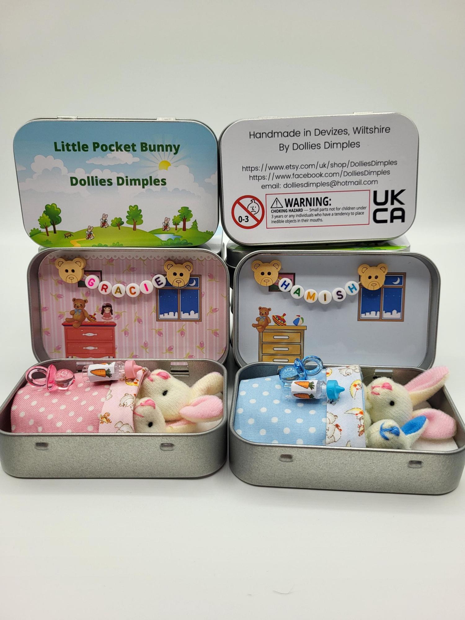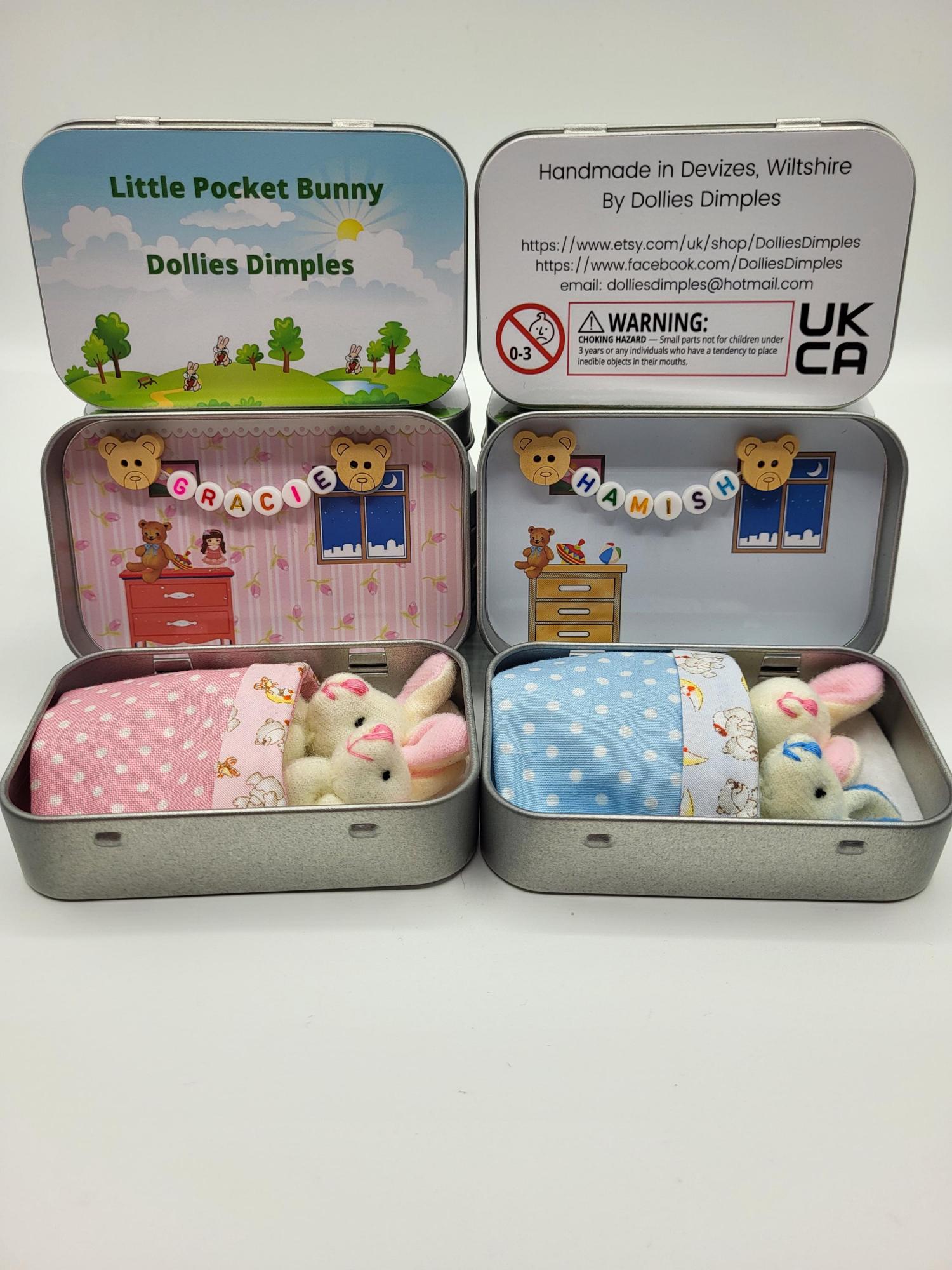 The baby rabbit with blue ears comes in a tin box with a blue vinyl sticker, and the baby rabbit with pink ears comes in a tin box with a pink vinyl sticker. The tin box measures approximately 9 cm.