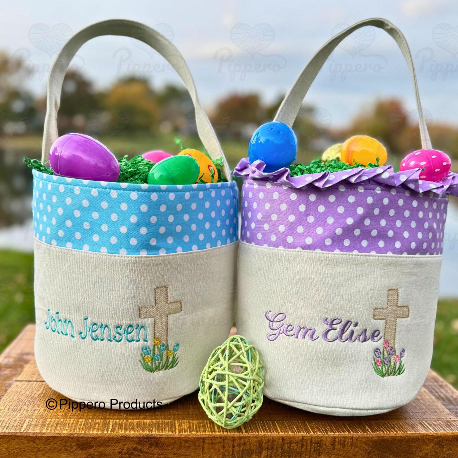 Personalized Easter baskets have a canvas exterior and a soft cloth lining. Name is professionally EMBROIDERED with high quality thread onto the basket for a lifetime of use. Handle is stabilized to stand up but can also be folded down for easy storage and more economical shipping.