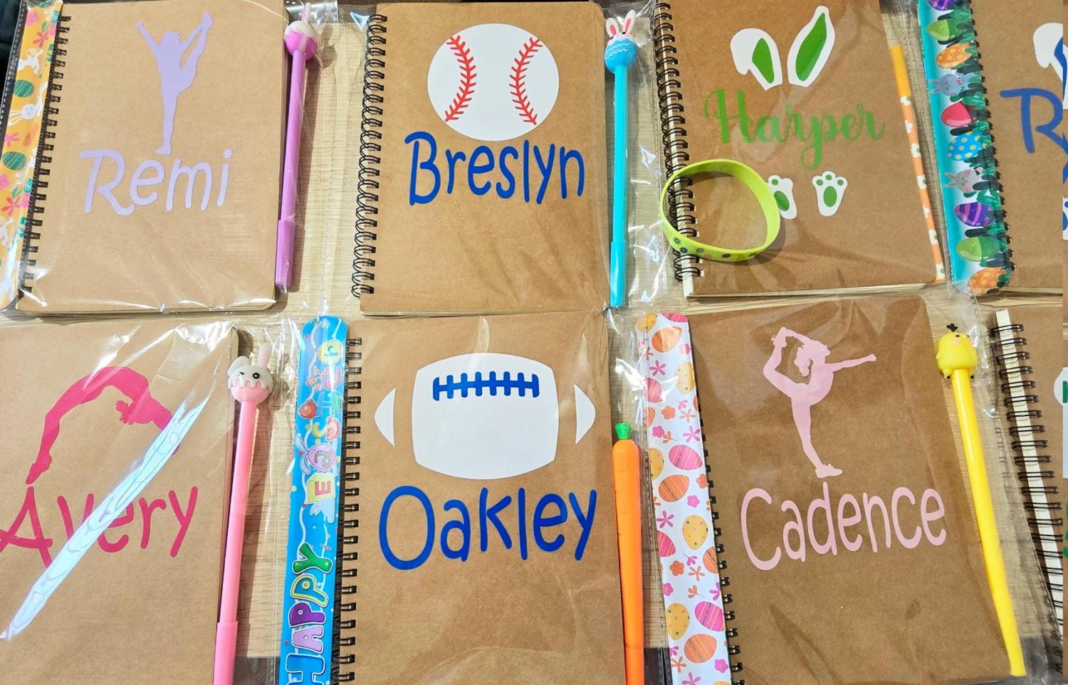 These cute and adorable personalized Easter Bunny spiral notebooks and pens are the perfect basket fillers and stuffers. NOW- they come with either a silicone bracelet or slap bracelet. They can be used as a diary, journal, notebook, or even for the artists in the making. These are the perfect Easter Basket Gifts, Easter Basket Stuffers and/or Party Favor.